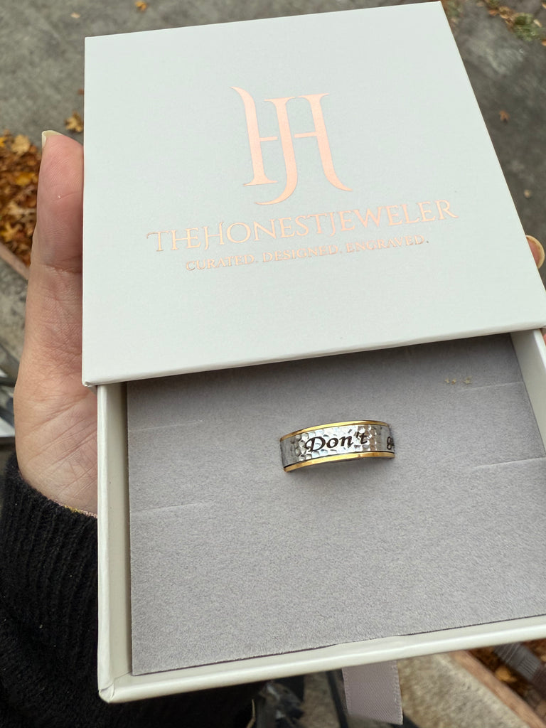 - This ring is fully customizable, allowing you to engrave any quote, word, or mantra that resonates with you. The personalized engraving makes this piece uniquely yours. Please note that each spinner ring is custom-made, ensuring it’s crafted perfectly for you.